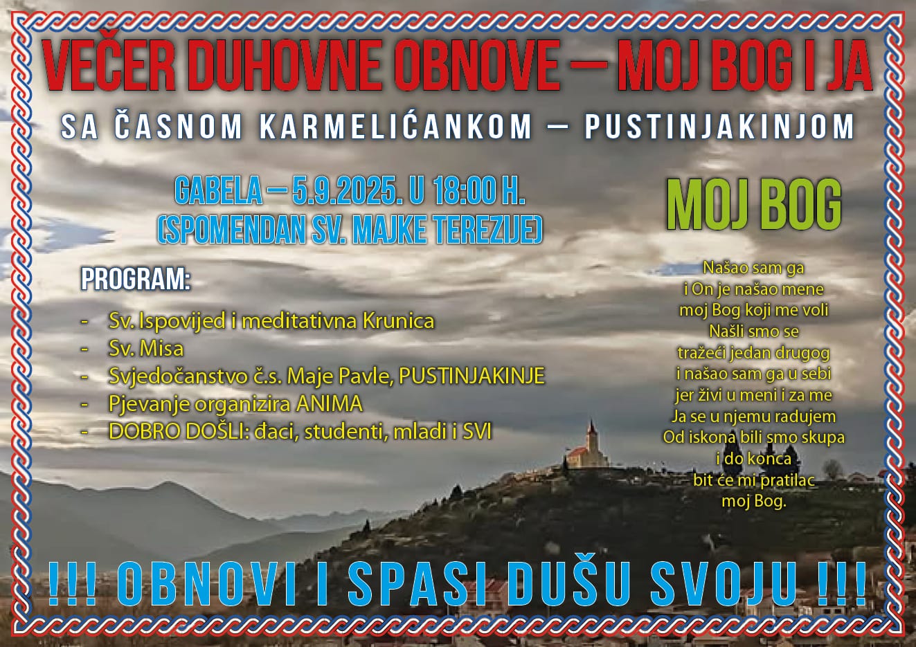VEČER DUHOVNE OBNOVE MOJ BOG I JA sa časnom karmelićankom – pustinjakinjom 📍 Gabela – 5.9.2025. u 18:00 h (spomendan sv. Majke Terezije) PROGRAM: • Sv. ispovijed i meditativna krunica • Sv. misa • Svjedočanstvo časne s. Maje Pavle, pustinjakinje • Pjevanje organizira ANIMA DOBRO DOŠLI! đaci, studenti, mladi i svi! !!! OBNOVI I SPASI […]