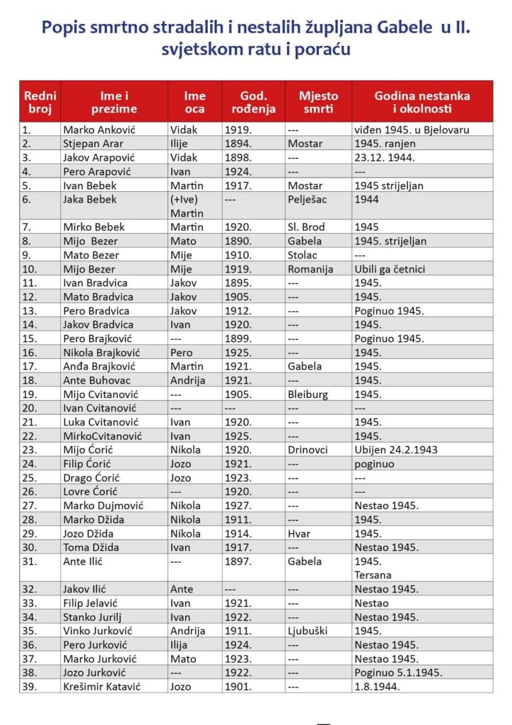 Njima u zahvalnost a nama na sjećanje slavit ćemo sv. Mise za duše njihove, početkom veljače kada su u Gabeli bila najveća stradanja!